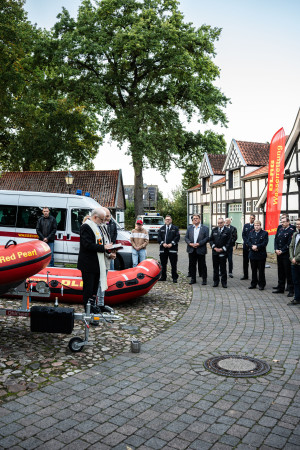 Der Höhepunkt der Veranstaltung fand im Freien statt: Das neue Rettungsboot wurde von Leonie Kulüke, Schwimmerin aus der Jugend der Ortsgruppe, feierlich auf den Namen „Red Pearl“ getauft. Sie hatte mit ihrem Namensvorschlag den zuvor ausgetragenen Namenswettbewerb unter den Kindern und Jugendlichen der Ortsgruppe gewonnen. Anschließend segneten die Pastoren Christoph Scholz und Konrad Pfannkuche das Boot im Rahmen eines ökumenischen Gottesdienstes. Im Anschluss klang die Feier in geselliger Runde aus.